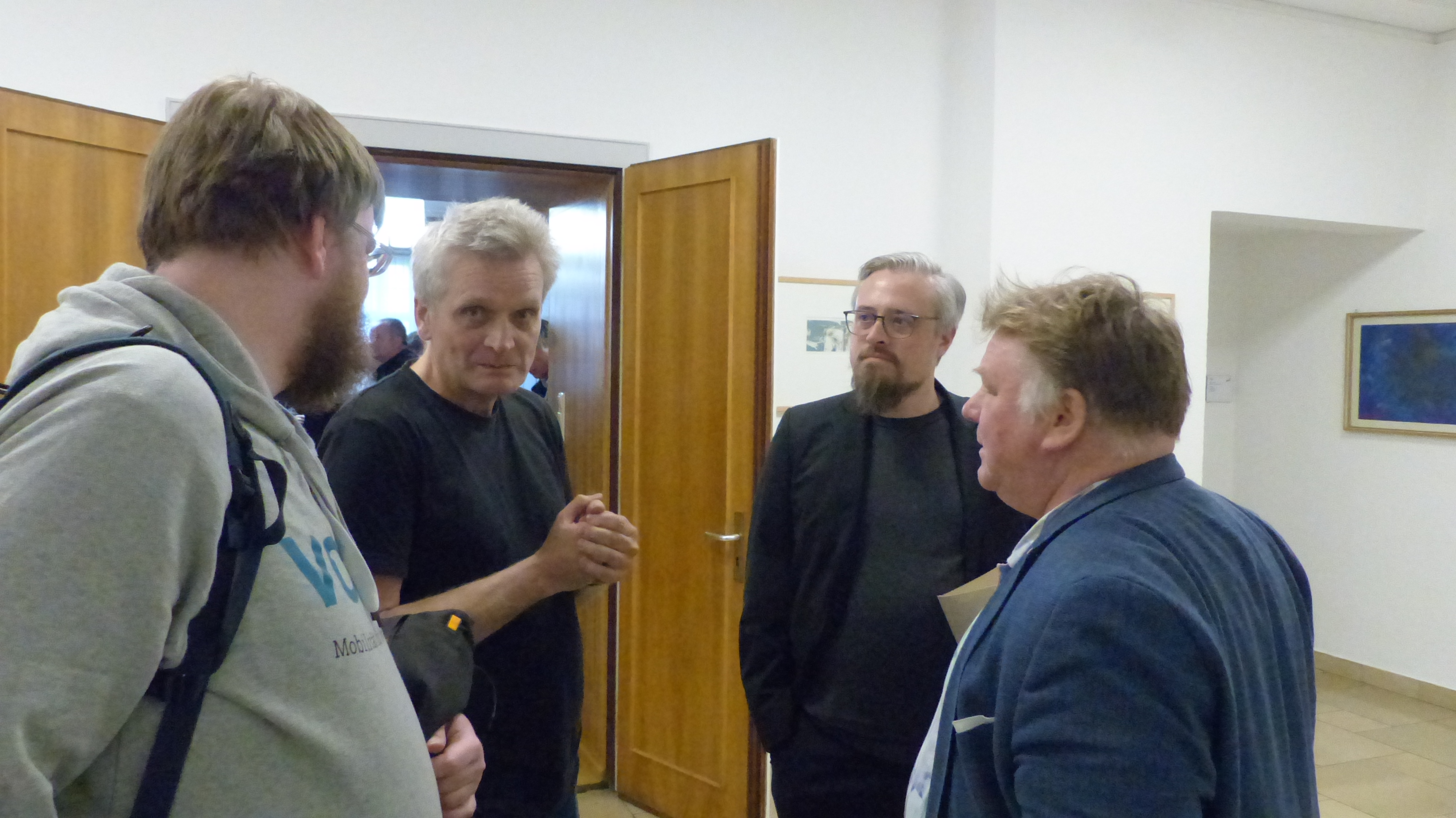 Bahnelektrifizierung Nordostbayern. Herausforderungen & Strategien Der Referent im Gespräch (v.l.n.r.) mit Lorenz Burghardt (VCD Bundesvorstand), Ralf Altenberger (Geschäftsführer VCD Bayern), Patrick Leitl & Christian Loos (Vorsitzender VCD Bayern |